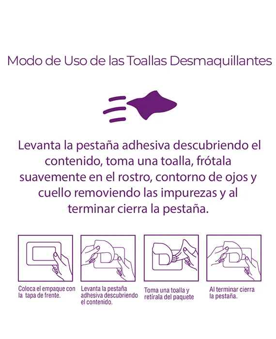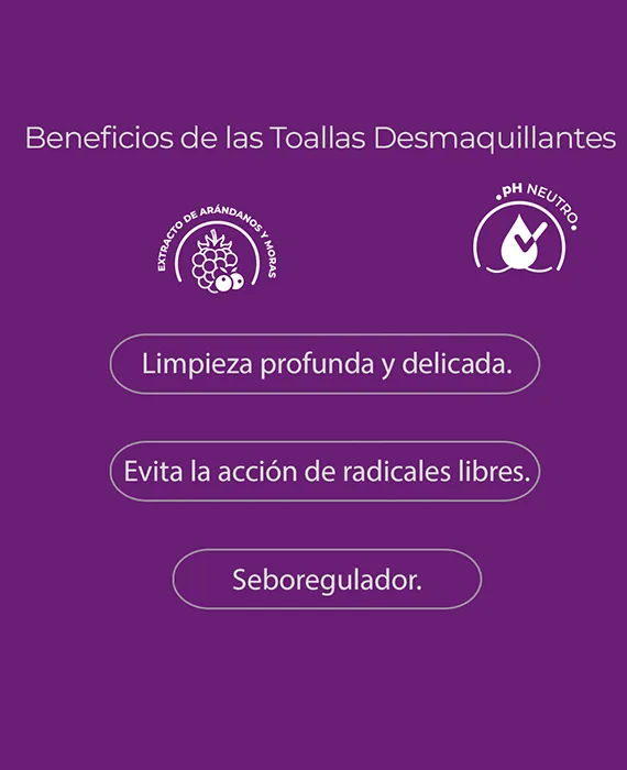 Enriquecidas con extracto de arándanos y moras, potentes antioxidantes naturales, estas toallas hacen más que limpiar: protegen tu rostro. Ayudan a evitar la acción de los radicales libres, principales causantes del envejecimiento prematuro, para que tu piel luzca joven y radiante.